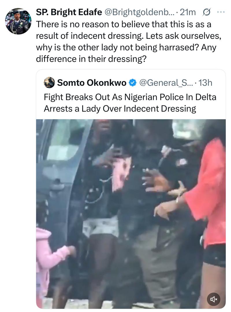 The Delta State Police Command spokesperson, SP Bright Edafe, has reacted to a video that went viral showing a police officer harassing a woman and arresting her for wearing indecent clothing.