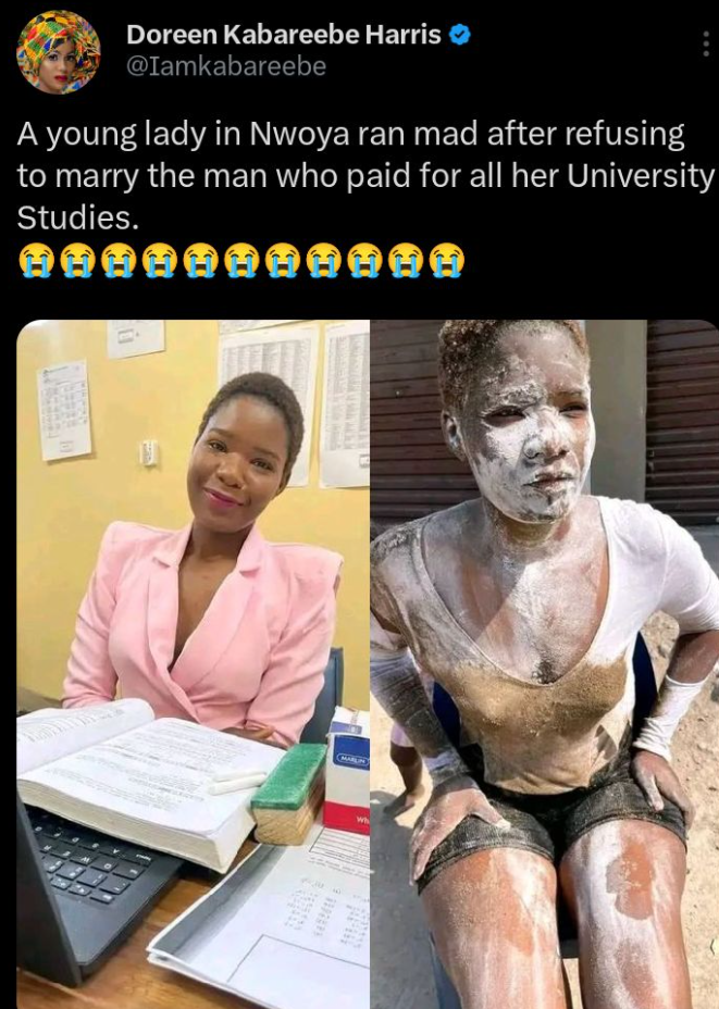 In Nwoya, there have been reports of a startling and unverified occurrence involving a young woman who purportedly had a mental breakdown after declining to wed the man who had paid for her whole college education.