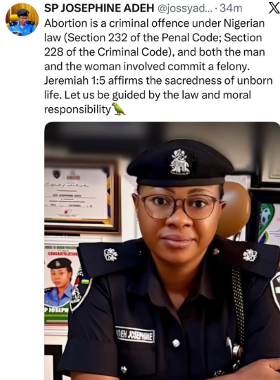 The FCT police command spokesperson, SP Josephine Adeh, has reminded Nigerians about the provisions of the law which prohibits abortion in Nigeria.