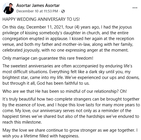 His outburst came just as Asortar shared a glowing tribute to his wife, Faith, marking their 4th wedding anniversary.