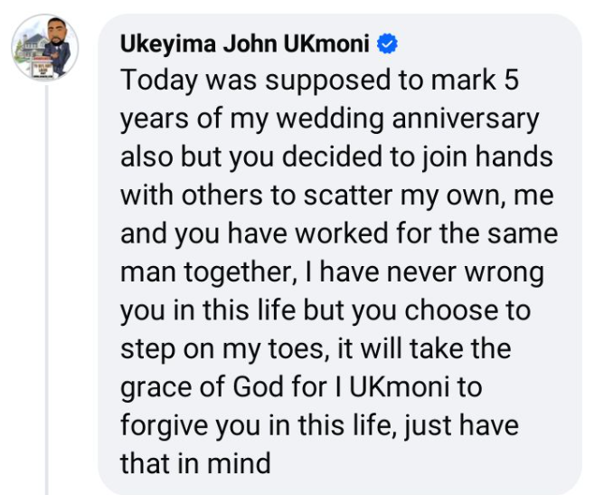 “Today was supposed to mark 5 years of my wedding anniversary also but you decided to join hands with others to scatter my own,” Ukeyima wrote.