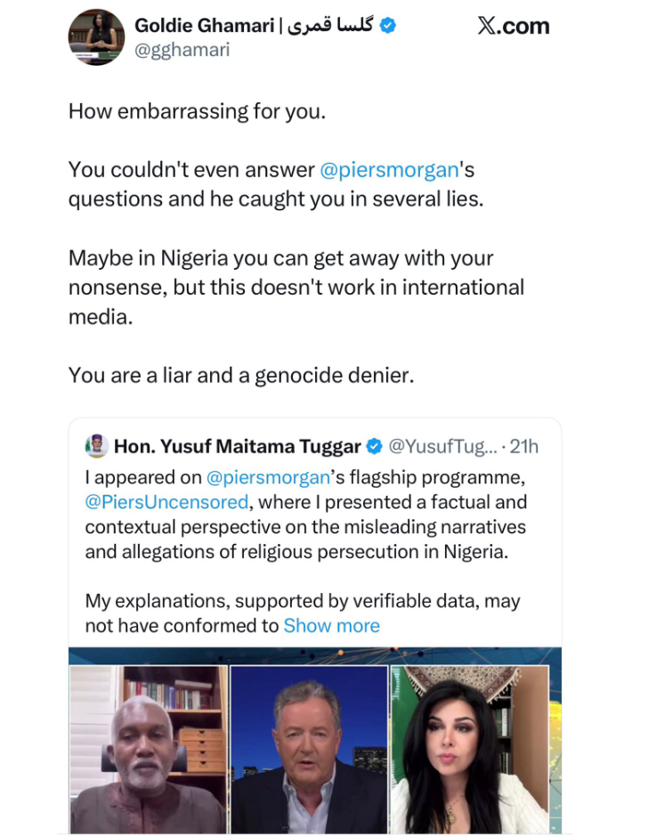 Canadian political analyst Goldie Ghamari has publicly accused Nigeria’s Minister of Foreign Affairs, Yusuf Tuggar, of lying during his recent interview with Piers Morgan regarding the alleged Christian genocide in Nigeria.