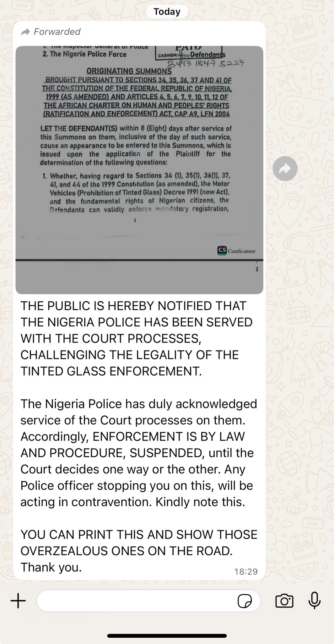 Some Nigerians had over the weekend insisted that the police was going against the court. They argued that a lawsuit had been filed by the Nigeria Bar Association challenging the powers of the law to enforce the acquisition of a tinted glass permit, and that since the matter is still in court, the police cannot commence the enforcement of the law as planned.