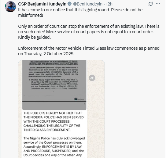 The spokesperson of the Nigeria Police Force, CSP Benjamin Hundeyin, has denied reports claiming a court has barred the police from enforcing the Motor Vehicle Tinted Glass law scheduled to commence on Thursday, 2 October 2025.