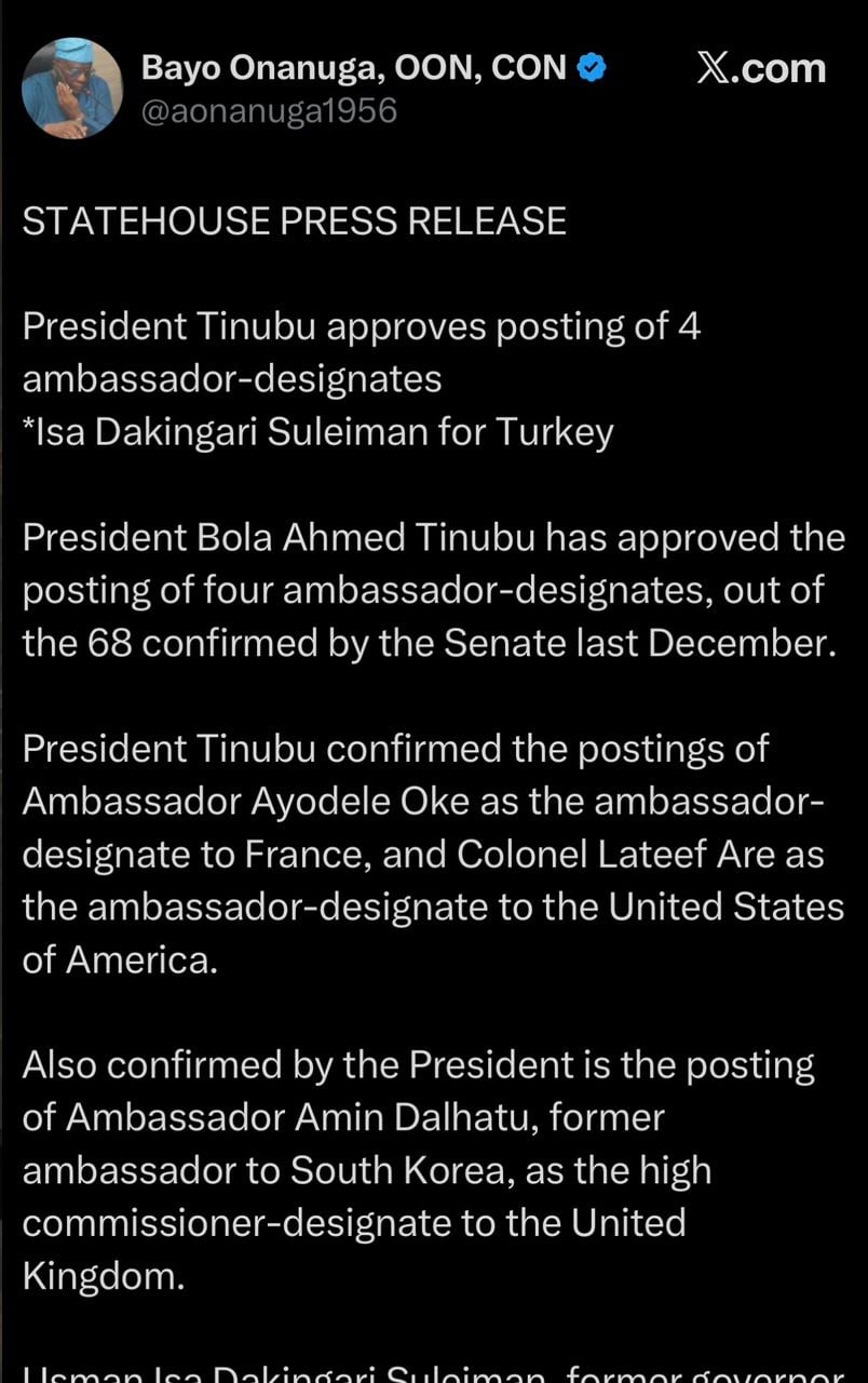 In a statement issued late Thursday by Bayo Onanuga, the presidency confirmed that Bola Tinubu had approved the posting of four ambassador-designates from the more than 60 nominees confirmed by the Senate last December. The initial announcement listed Kayode Are, a former director-general of the Department of State Services, as ambassador-designate to the United States; Ayodele Oke, former director-general of the National Intelligence Agency, as ambassador-designate to France; Amin Dalhatu, former ambassador to South Korea, as high commissioner-designate to the United Kingdom; and Dakingari as ambassador-designate to Turkey.