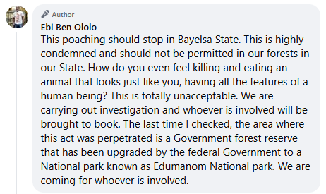 This poaching should stop in Bayelsa State. This is highly condemned and should not be permitted in our forests in our State. How do you even feel k!lling and eating an animal that looks just like you, having all the features of a human being? This is totally unacceptable,” he said.