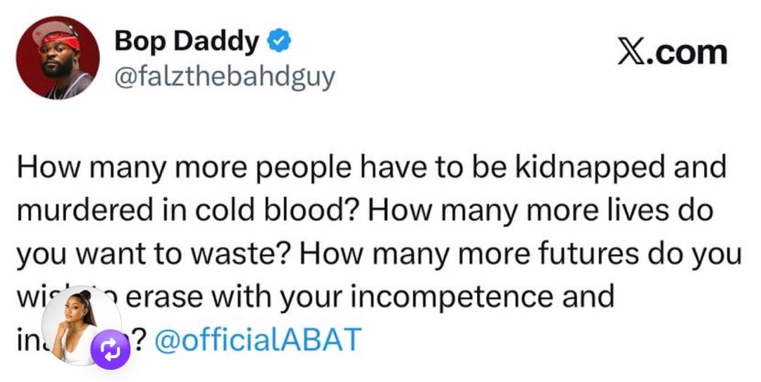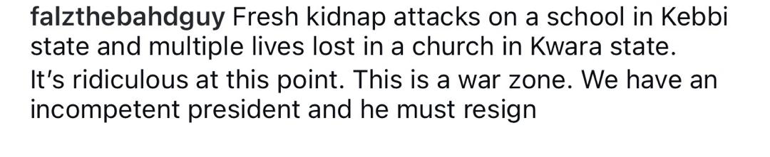Following the increasing spate of insecurity across the country, rapper, Folarin Falana aka Falz, has called for the resignation of President Tinubu. In a post shared on X, Falz asked the President to vacate his seat following the several k!dnapping and k!llings in the country. He said the President has consistently shown his unwillingness to protect the lives of Nigerians and asked him to resign now.