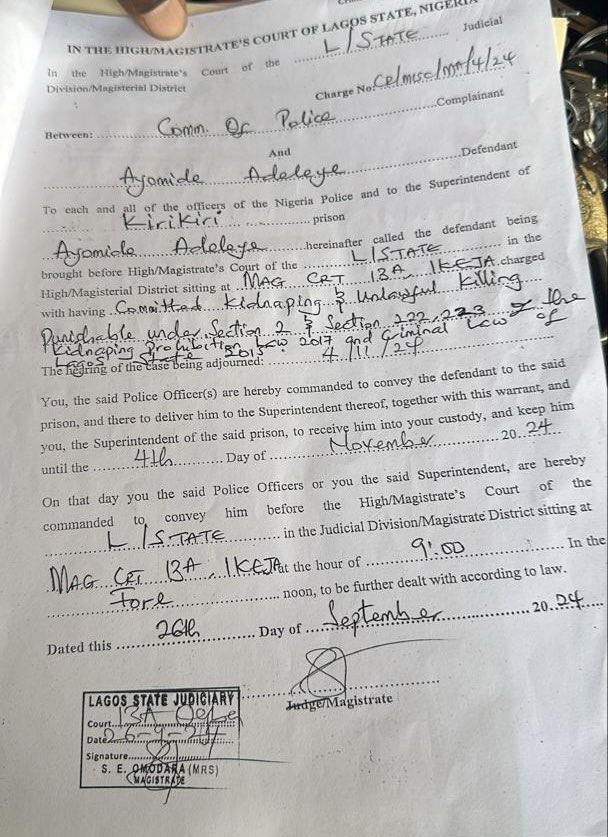 On November 5, Adeleye appeared before Magistrate Seyi Omodara at the Ogba Magistrate Court, where she granted a remand warrant for his detention at the Ikoyi prison pending the availability of the Director of Public Prosecutions (DPP) advice.