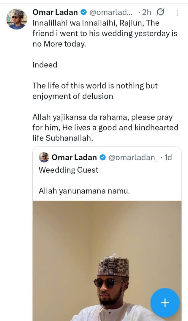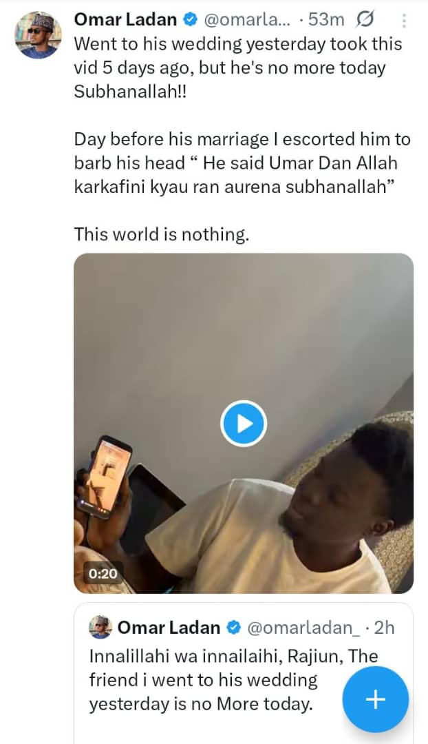 He then shared a video of the deceased taken shortly before his wedding and added: “Went to his wedding yesterday took this vid 5 days ago, but he’s no more today. Subhanallah!!