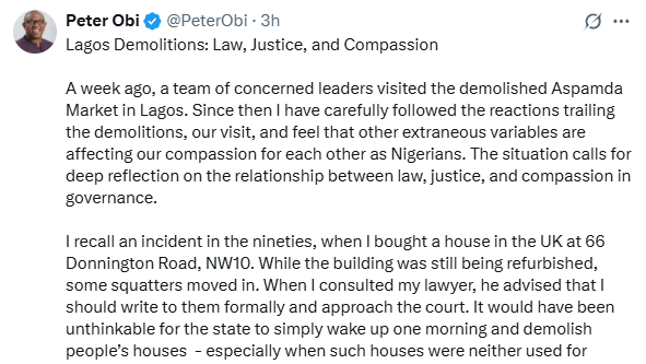 In response to the recent demolition of buildings at the ASPAMDA Market in the Trade Fair Complex, Obi made this statement on his X account this morning, October 7. He claimed that demolishing properties due to documentation errors—which he questions—is equivalent to giving a man who stole a bicycle the death penalty rather than a prison term. He questioned whether it was acceptable for the state government to destroy millions of dollars’ worth of investment just because it lacked the required paperwork.