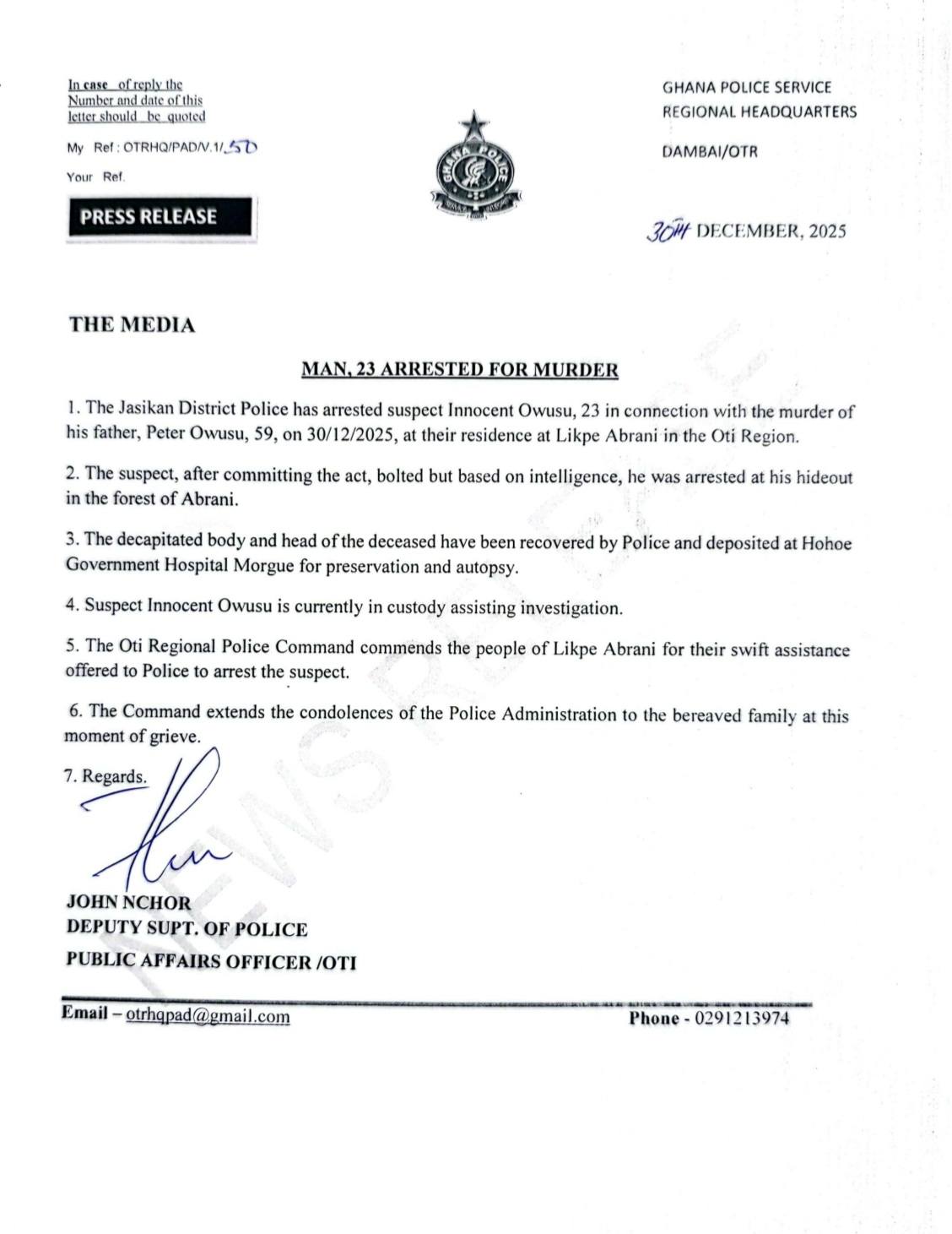 The Oti Regional Police Command commended residents of Likpe Abrani for their swift cooperation and assistance, which contributed to the successful arrest of the suspect.