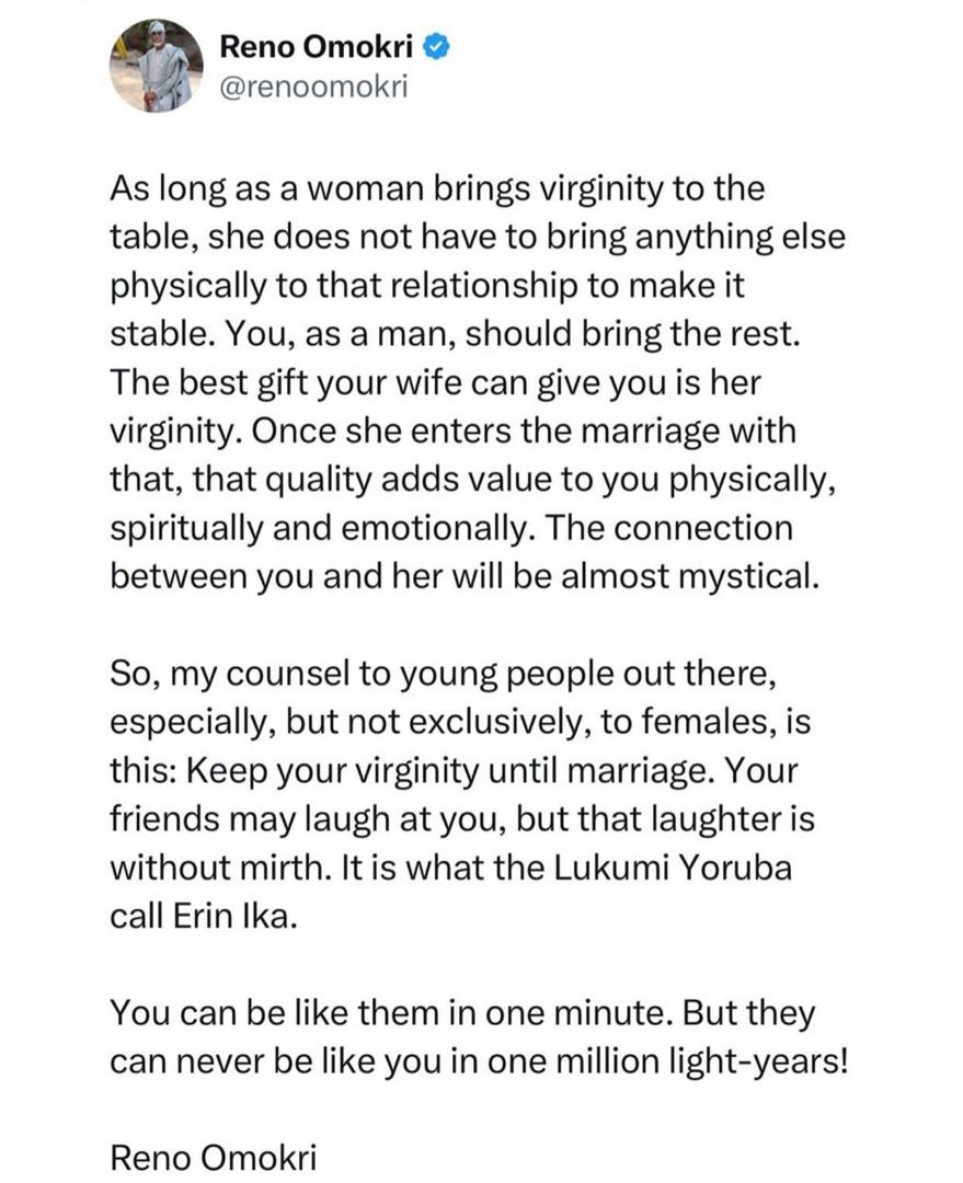 In his post, Reno argued that as long as a woman brings her virginity to the relationship, her man is the one that is expected to bring every other thing in the relationship.