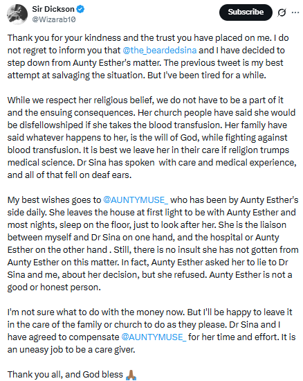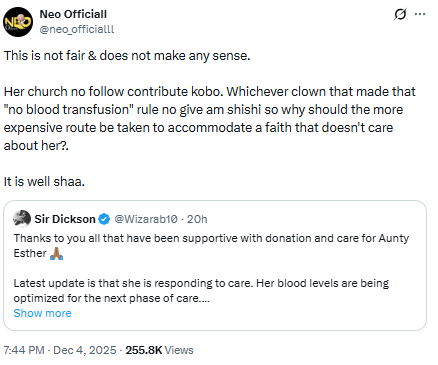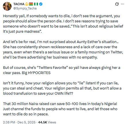 However, at the hospital, Aunty Esther refused blood transfusion and those handling the funds came on X to express frustration.