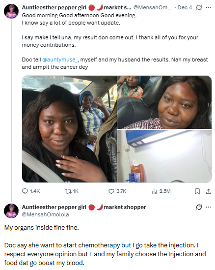 Aunty Esther, a vendor known on X for openly advertising her trade, recently revealed she was suffering breast cancer and was fighting it the natural way. X users raised funds for her treatment and urged her to try modern medicine.