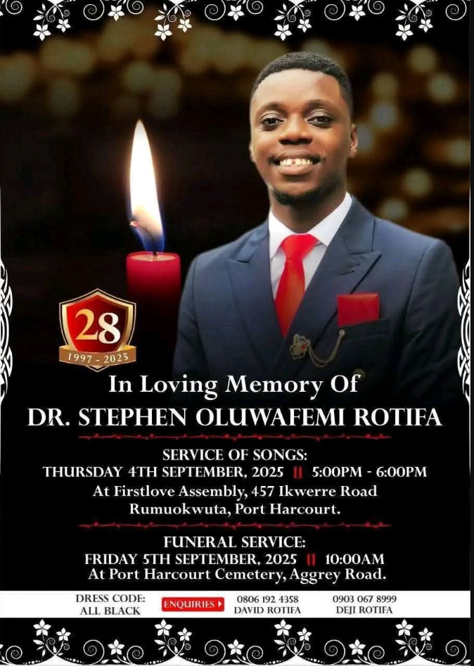 Rotifa, a former president of the Port Harcourt University Medical Students’ Association (PUMSA), has been mourned widely, with his passing sparking grief and outrage in Nigeria’s health sector. The Nigerian Medical Association (NMA) has announced plans to conduct an autopsy to confirm the cause of death.