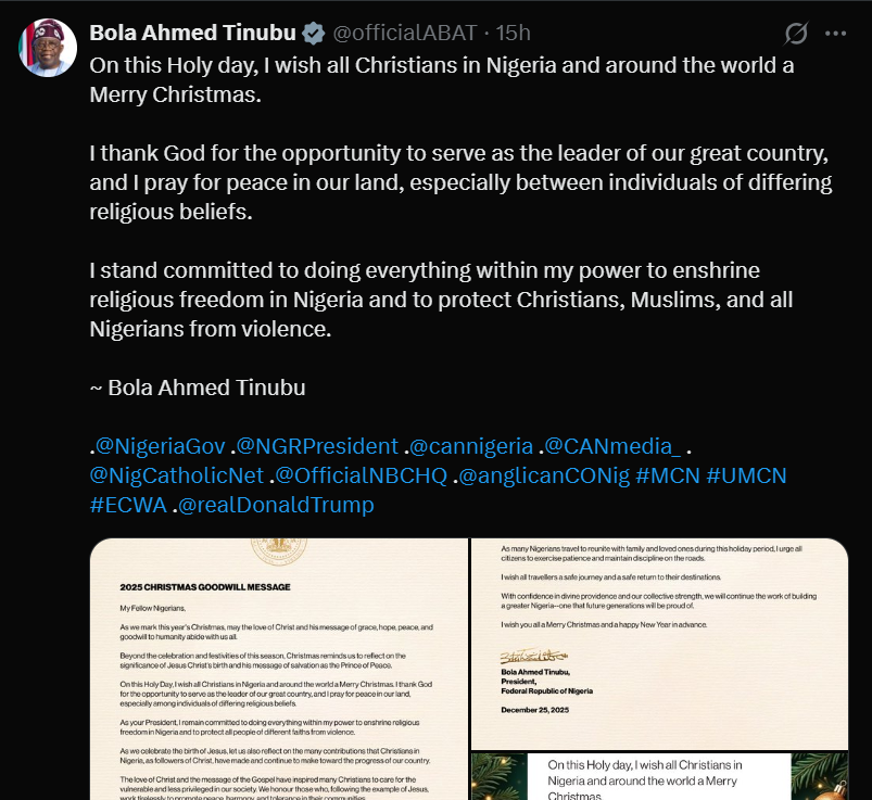 The president also shared excerpts from his 2025 Christmas goodwill message, in which he called on Nigerians to embrace peace, patience, and unity throughout the festive season.