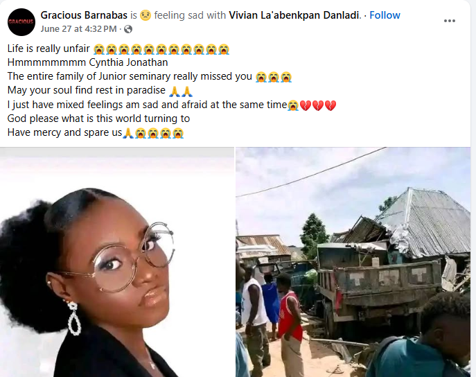 A Taraba State University graduate, Cynthia Jonathan, was k!lled when a truck loaded with shaft sand lost control and rammed into the busy Mile 6 Market in Jalingo.