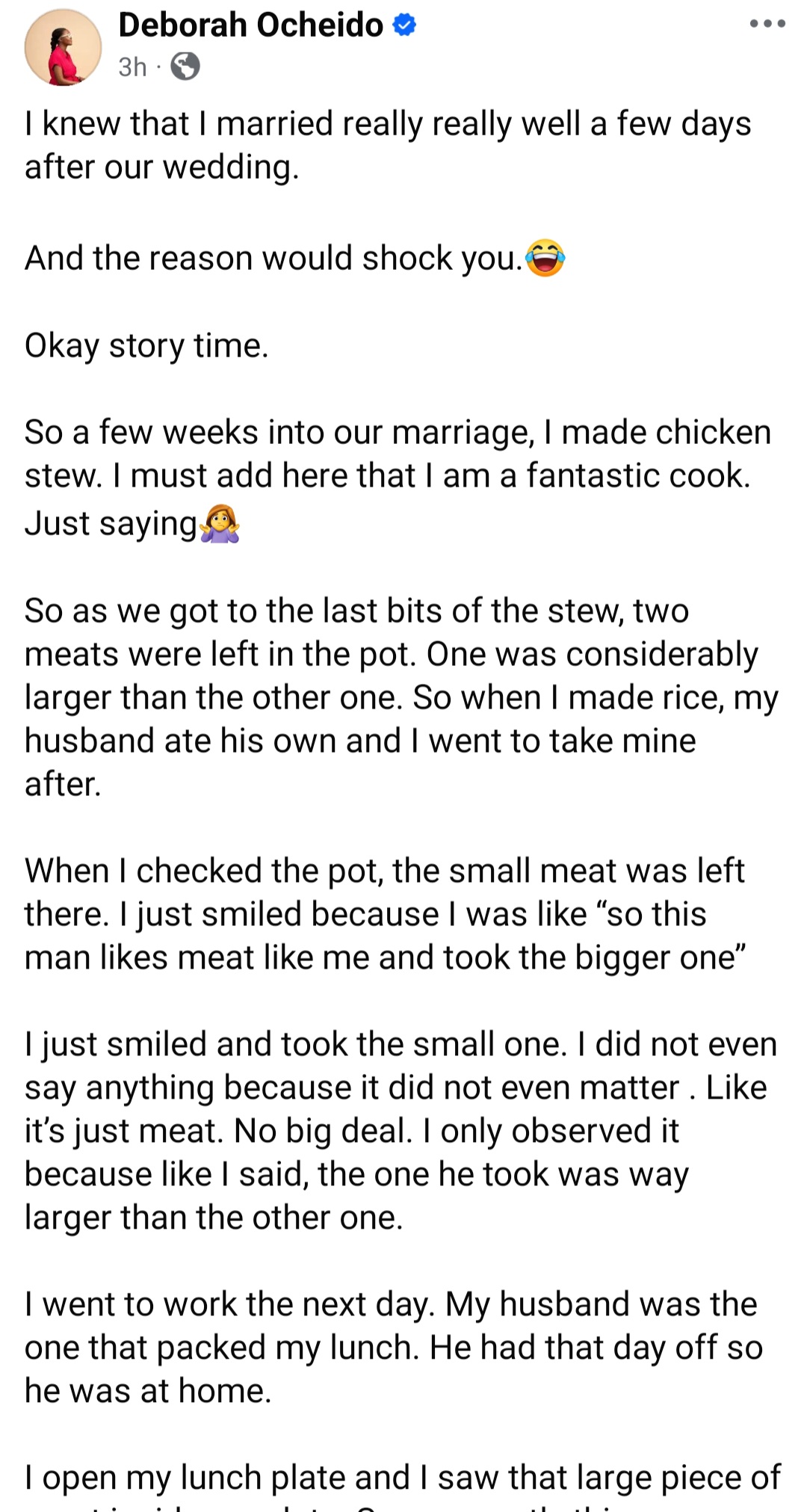 Deborah Ocheido took to Facebook to share how her husband put his need above hers. She said that singular incident reassured her that she chose well.