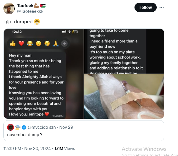 The individual, identified as @Taofeeekkk on X, expressed his feelings on the platform in response to a post inviting users to share their experiences of being dumped in November.